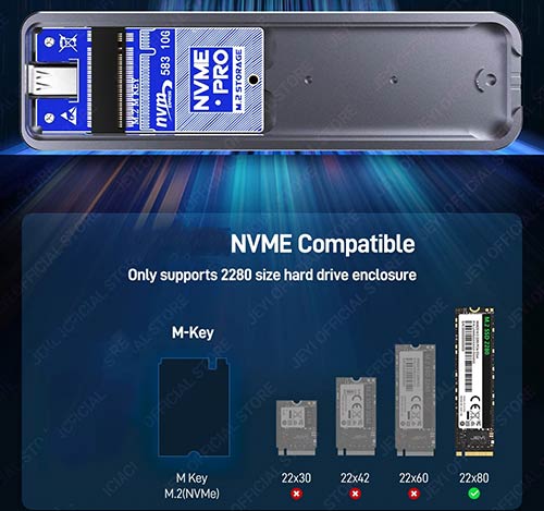 • NVMe hard drive enclosure compatible with M.2 M-key 2280 hard drives.